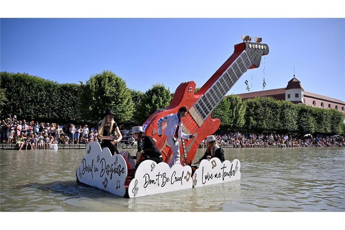 "Musikalische" Boote wie diese schwimmende Riesengitarre fahren bei der Regatta eines Musikfestivals im tschechischen Holešov.