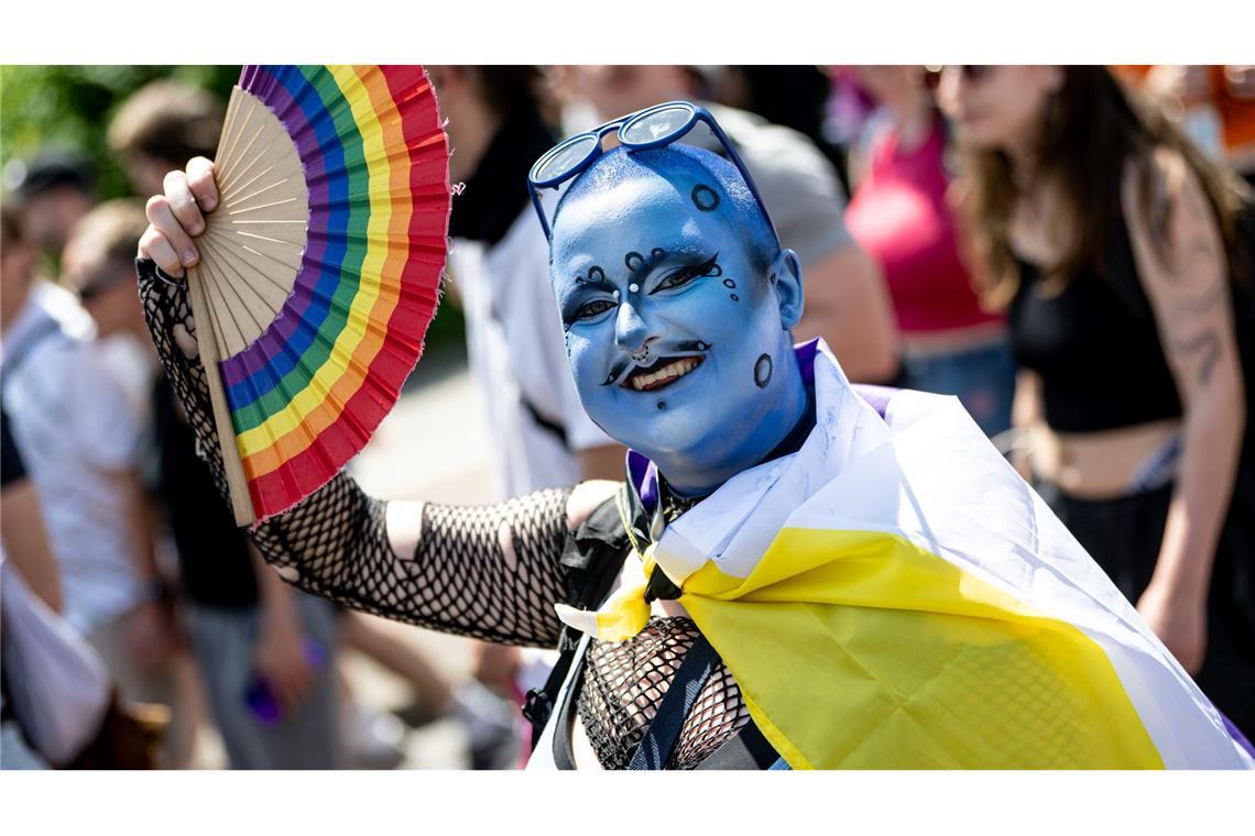 Regenbogenfarben ist der Fächer eines Teilnehmers bei der Marzahn Pride im Stadtteil Marzahn in Berlin.