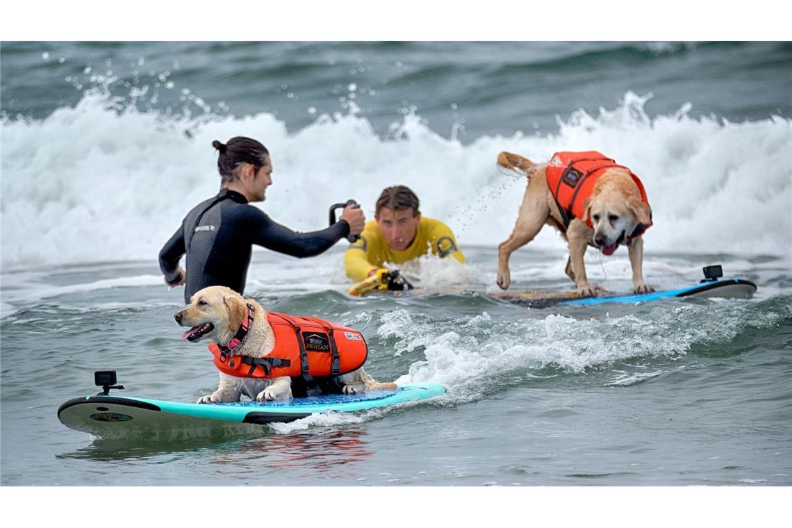 Rosie, ein zweieinhalb Jahre alter Labrador aus Santa Cruz, Kalifornien, startet auf einer Welle vor Charlie, einem zehn Jahre alten Labrador aus San Diego, bei der 28. Auflage der "Purina Pro Plan Incredible Dog Challenge" in Huntington Beach, Kalifornien.
