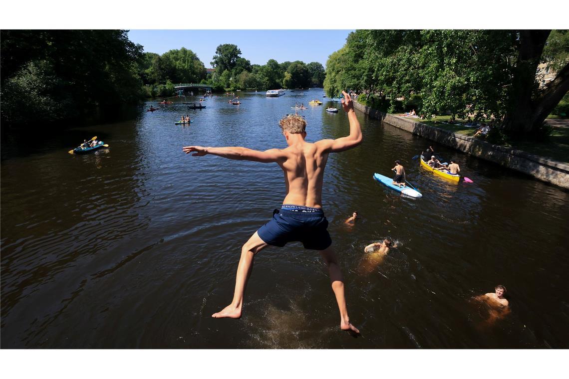 Sommerwetter in Hamburg: Ein junger Mann springt von einer Brücke in die Alster.