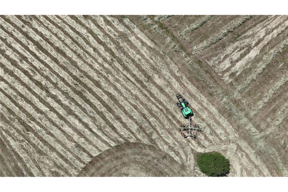 Von oben gesehen: Ein Bauer fährt bei sommerlichem Wetter mit seinem Traktor über ein Feld in Bad Oeynhausen in NRW (Luftaufnahme mit einer Drohne).