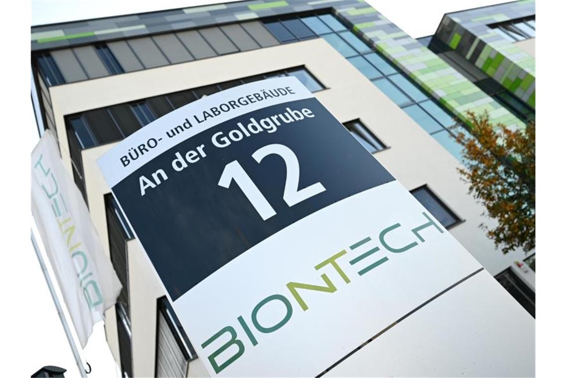 Das Logo des Biotechnologie-Unternehmens „BioNTech“ ist an einer Stele vor der Unternehmenszentrale angebracht. Foto: Arne Dedert/dpa
