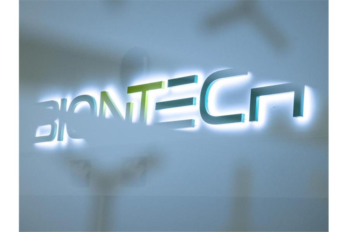 Das Logo der Firma Biontech am Produktionsstandort in Marburg. Foto: Boris Roessler/dpa