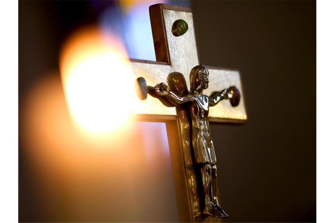 Ein Jesuskreuz und eine brennende Kerze. Foto: Ronny Hartmann/dpa/Symbolbild