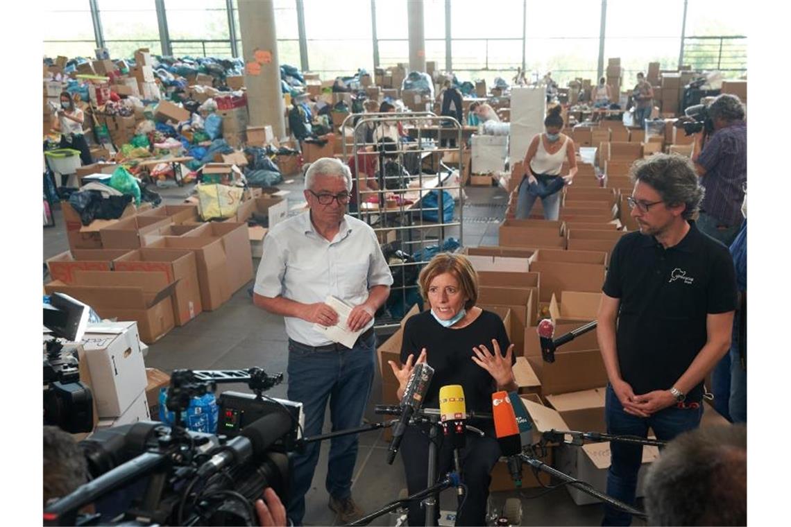 Die rheinland-pfälzische Ministerpräsidentin Malu Dreyer und Innenminister Roger Lewentz besuchen das Spendenzentrum am Nürburgring. Foto: Thomas Frey/dpa