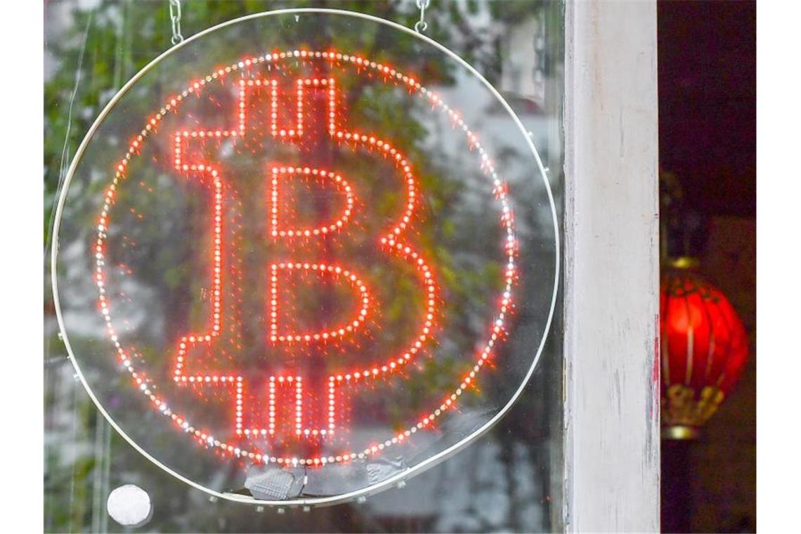 Ein Bitcoin-Logo in einem Schaufenster einer Kneipe im Kreuzberger Graefekiez. Foto: Jens Kalaene/ZB/dpa