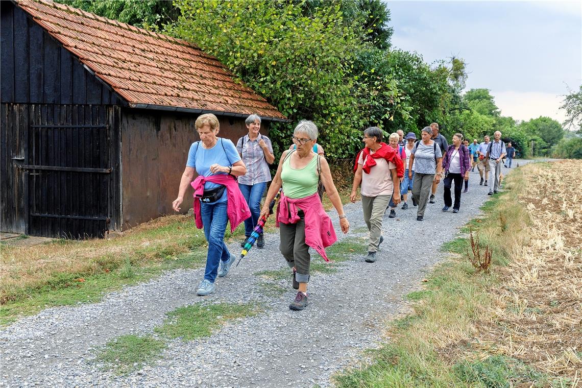 Vom Bahnhof geht’s Richtung Nordosten in den Kirchweg hinein. Fritz Kemmler aus Erbstetten kennt das Gemeindegebiet bestens. Zehn Jahre lang war er bei der Flurbeteiligung beteiligt. Für die Wanderung hat er seine Trachtenlederhose aus dem Schrank geholt. Beim evangelischen Kindergarten angekommen weist Wiedersatz auf eine Besonderheit hin: „Das hat fast keine Gemeinde: Wir haben einkommensabhängige Kindergartengebühren. Das heißt, der, der viel verdient, zahlt auch viel, und die, die wenig haben, zahlen wenig.“ Zudem spricht die Bürgermeisterin den Naturkindergarten an, den die Gemeinde derzeit für 20 Kinder beim Freibad einrichtet.