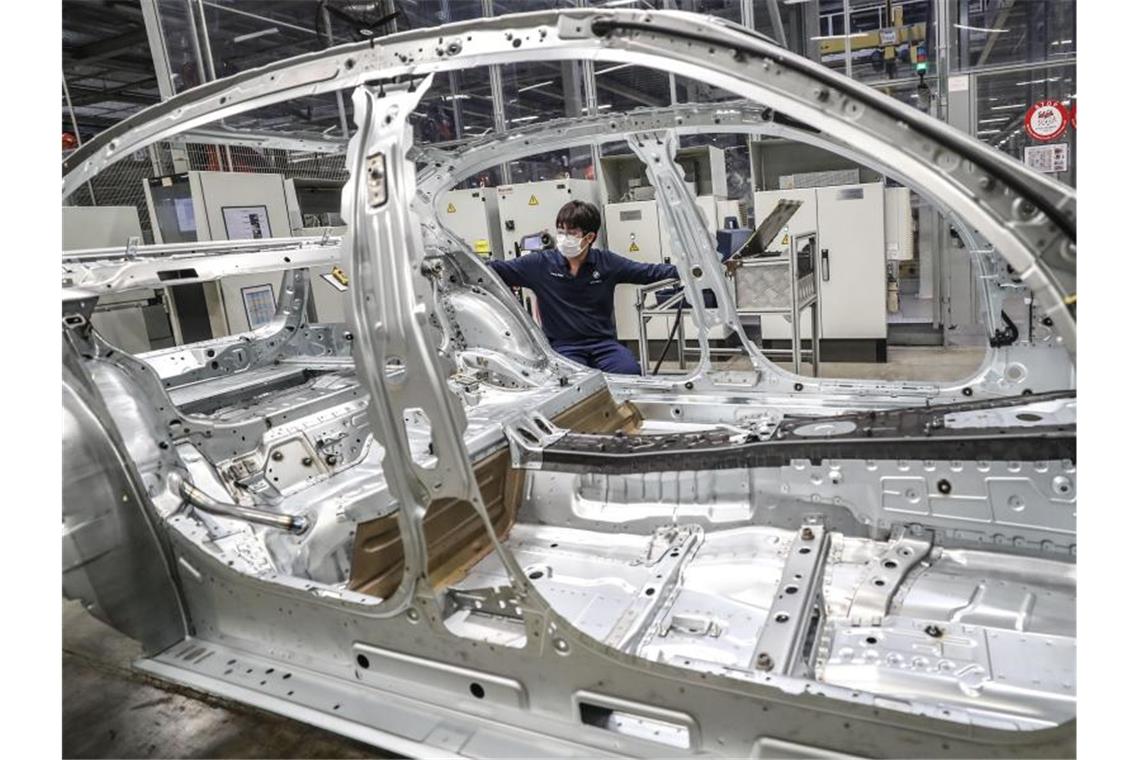 Ein Mann arbeitet im Tiexi-Werk von BMW Brilliance Automotive (BBA). BMW hat die Mehrheit an dem Gemeinschaftswerk mit dem chinesischen Autobauer Brilliance in China übernommen. Foto: Pan Yulong/XinHua/dpa