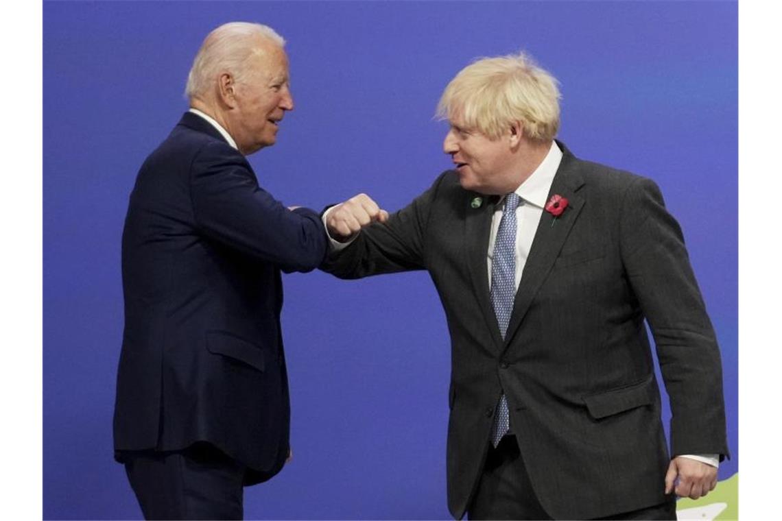 Der britische Premierminister Boris Johnson (r) begrüßt US-Präsident Joe Biden bei dessen Ankunft zum UN-Klimagipfel COP26 in Glasgow. Foto: Christopher Furlong/Getty Pool/AP/dpa