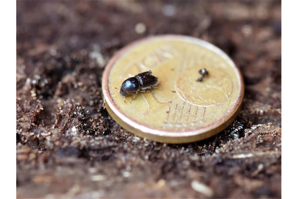 Ein Borkenkäfer krabbelt beim Schliffkopf im Schwarzwald über eine Ein-Cent-Münze, die auf einer Fichtenrinde liegt. Foto: picture alliance / Uli Deck/dpa/Symbolbild