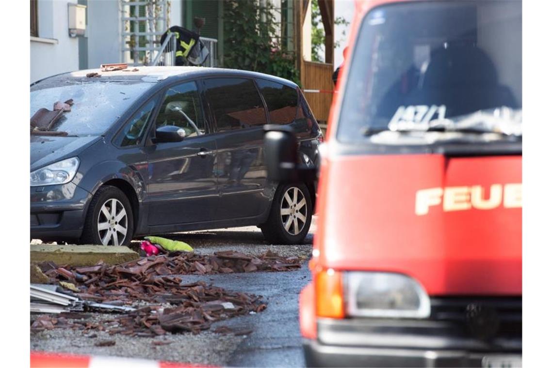 Neben einem Feuerwehrfahrzeug steht ein Auto vor einem stark beschädigten Haus, an und auf dem Auto liegen Trümmer. Foto: Stefan Puchner