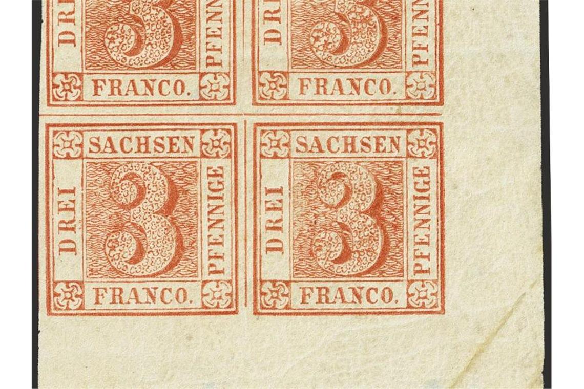 Die Briefmarke mit dem Nennwert von 3 Pfennigen war die erste im Königreich Sachsen. Sie stammt aus dem Jahr 1850. Der Ende März zur Versteigerung gestellte Block umfasst vier bräunlich-rote Marken und ist ungestempelt. Er stammt den Angaben zufolge aus der Privatsammlung des ehemaligen Tengelmann-Chefs Erivan Haub.