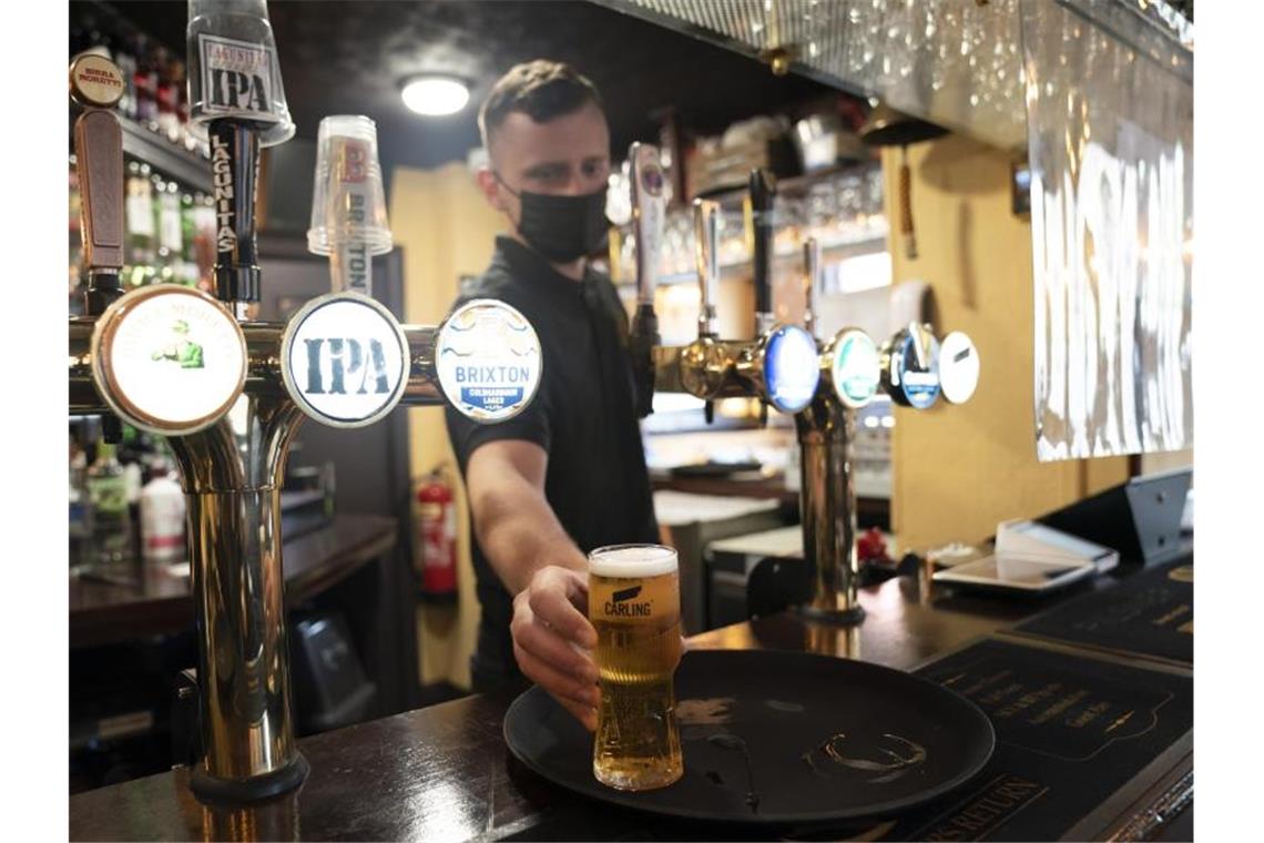 Ein Mitarbeiter eines Pubs serviert ein Bier. Trotz weitreichender Lockerungen von Corona-Regeln haben britische Pubs erneut deutlich weniger Bier verkauft als vor der Pandemie. Foto: Jon Super/AP/dpa