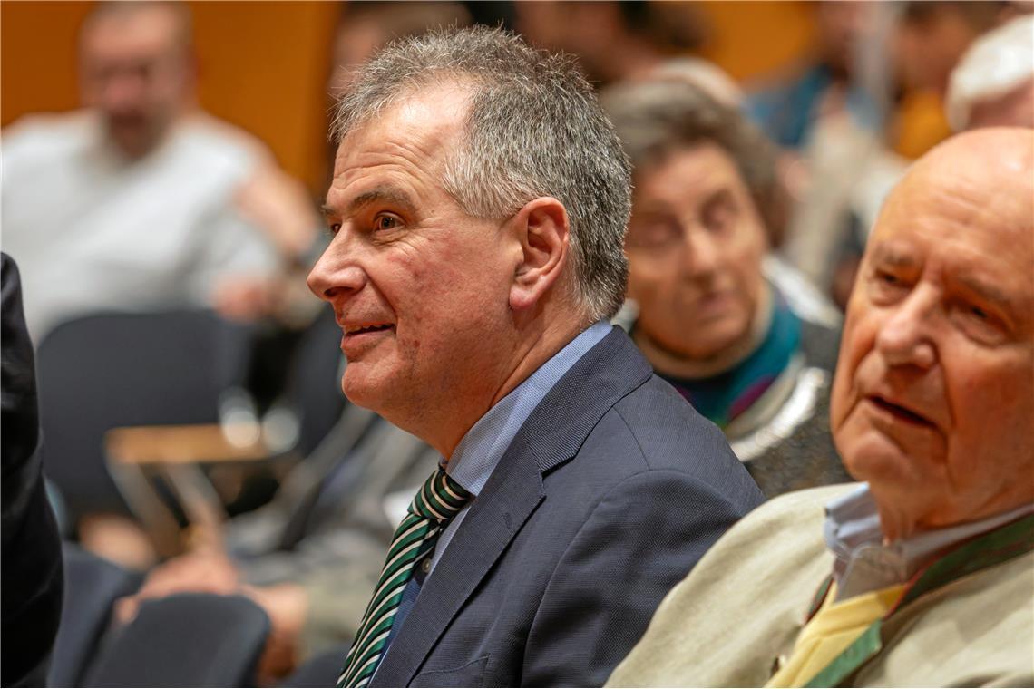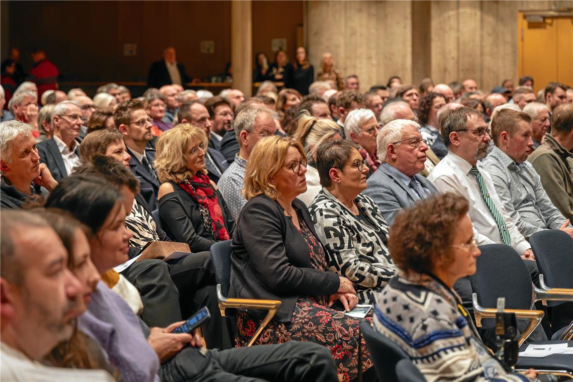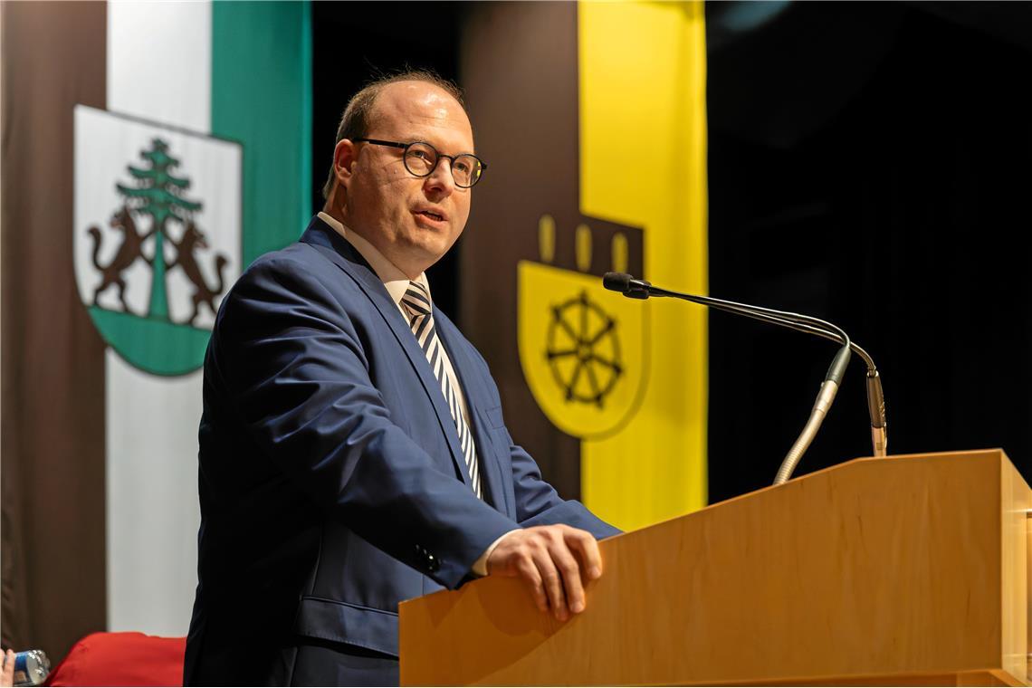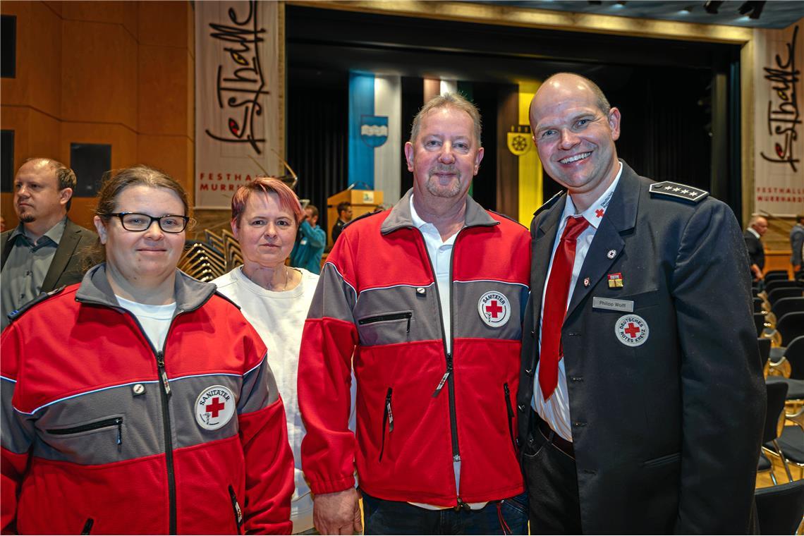 Bürgerempfang 2025 in der Murrhardter Festhalle. v.l. Polizeichef von Backnang, Dennis Ehrhardt, Stellvertretender Leiter der Feuerwehr Murrhardt, Marc Schmid, Feuerwehr Kommandant von Murrhardt, Stefan Krehan und der Murrhardter Polizeichef Sven Schock.
