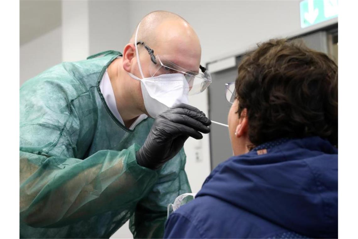 Abstrich im Corona-Testzentrum der Universitätsmedizin in Graal-Müritz. Foto: Bernd Wüstneck/dpa-Zentralbild/dpa