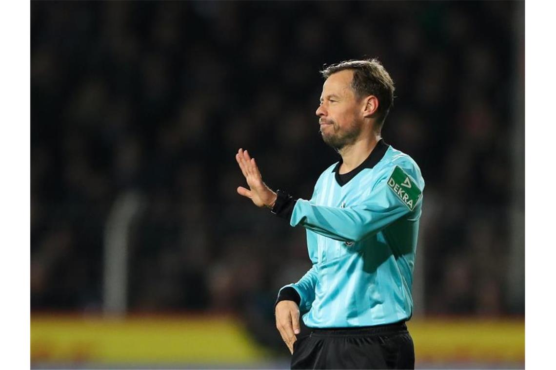 Schiedsrichter Markus Schmidt gibt ein Handzeichen. Foto: Friso Gentsch/dpa/Archivbild