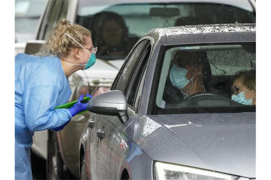 Eine Mitarbeiterin einer Teststation bereitet Autofahrer auf einen COVID-19-Test vor. Foto: Mark Baker/AP/dpa