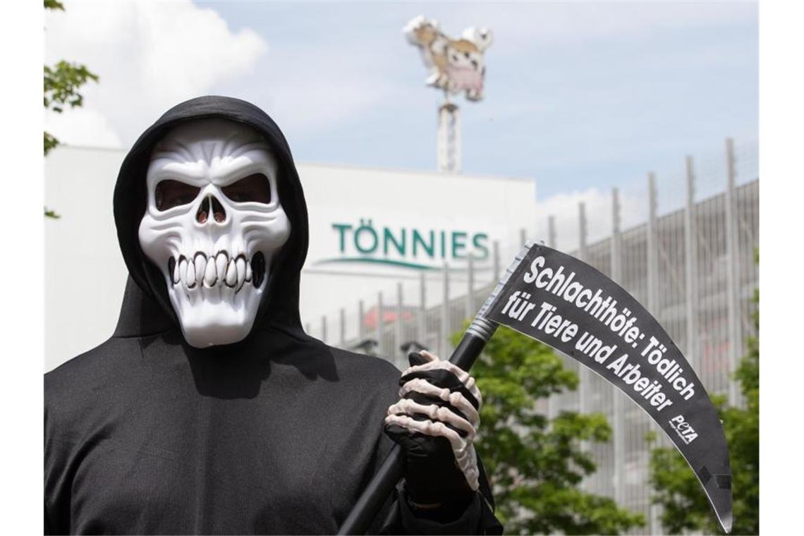 Ein Peta-Aktivist, verkleidet als Tod, protestiert vor dem Tönnies-Werk in Rheda-Wiedenbrück. Foto: Friso Gentsch/dpa