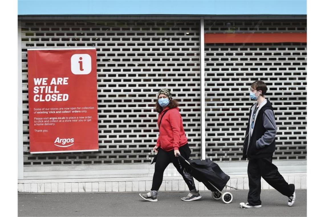 Menschen mit Mundschutz gehen Ende Juni an einem geschlossenen Laden im Stadtzentrum von Leicester vorbei. Großbritannien ist wegen der Corona-Krise in eine Rezession gerutscht. Foto: Rui Vieira/AP/dpa
