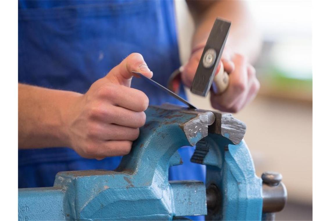 Ein Auszubildender steht mit einem Hammer an einem Schraubstock. Betriebe, die Azubis von insolvent gegangenen Firmen übernehmen, sollen eine staatliche Prämie bekommen. Foto: Sebastian Kahnert/dpa-Zentralbild/dpa