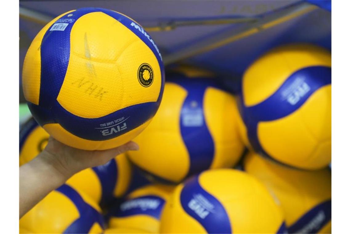 Volleybälle liegen in einer Halle. Foto: Soeren Stache/dpa-Zentralbild/dpa/Symbolbild