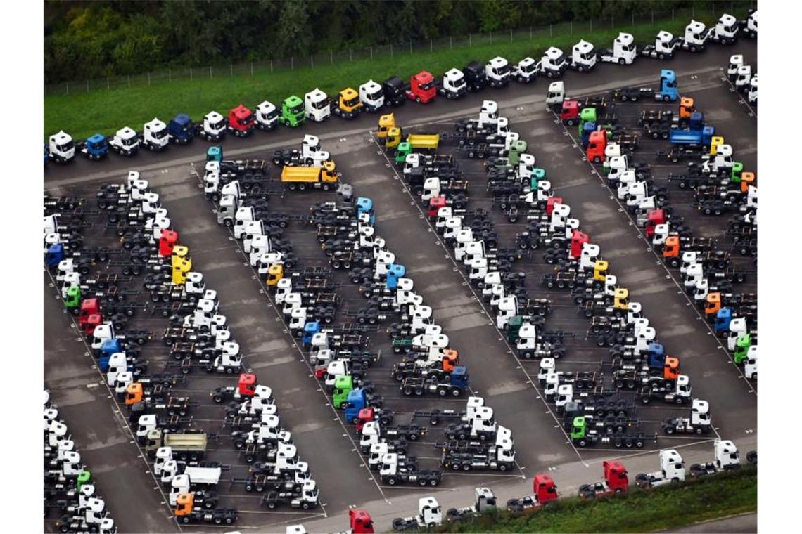 Beim Gelände der Daimler AG im Lkw Mercedes-Benz-Werk Wörth stehen Lastwagen. Foto: Uli Deck/dpa/archivbild