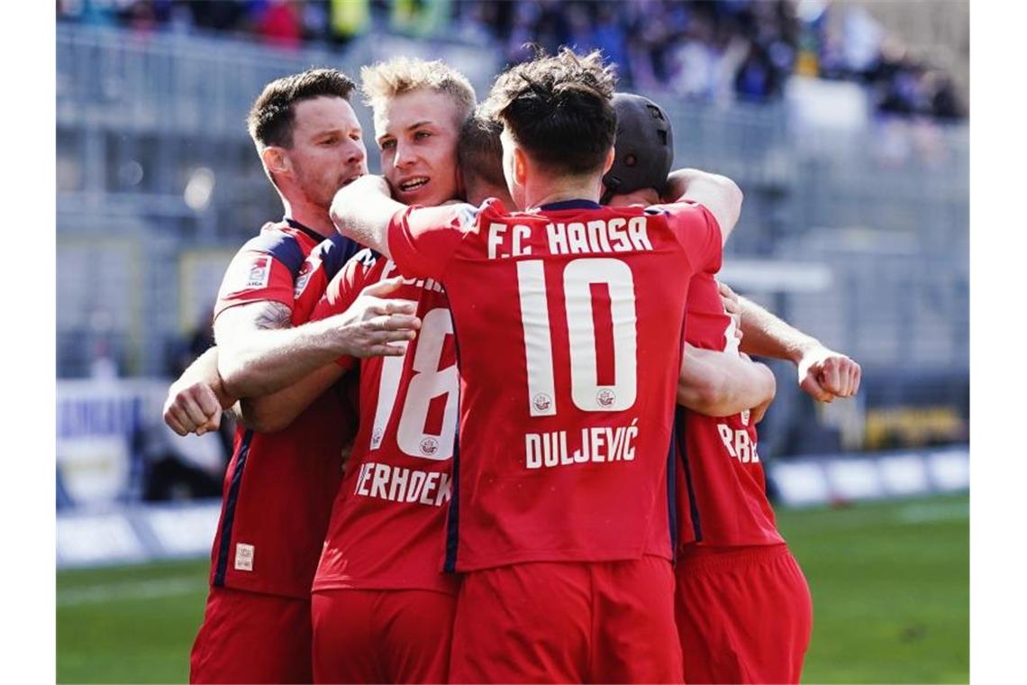 Rostocks Mannschaft jubelt über das Tor zum 0:1. Foto: Uwe Anspach/dpa
