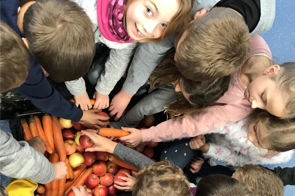 Zum Zugreifen: Den Schulen und Kitas kommt es entgegen, wenn Obst und Gemüse stückweise geliefert wird und nicht erst geschnitten werden muss. Äpfel, Karotten, Birnen oder Mandarinen sind daher besonders geeignet. Foto: Hofgut Hagenbach
