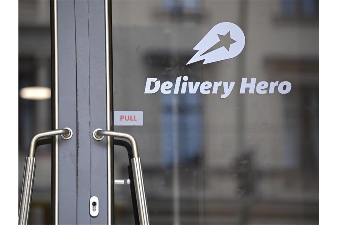 Das Logo Essenslieferdienstes Delivery Hero ist an einer Glasscheibe der Zentrale angebracht. Der Lieferdienst blickt vor allem auf den Weltmarkt. Übernahmen und Investitionen sorgen für schnelles Wachstum bei hohen Verlusten. Foto: Britta Pedersen/dpa-Zentralbild/dpa