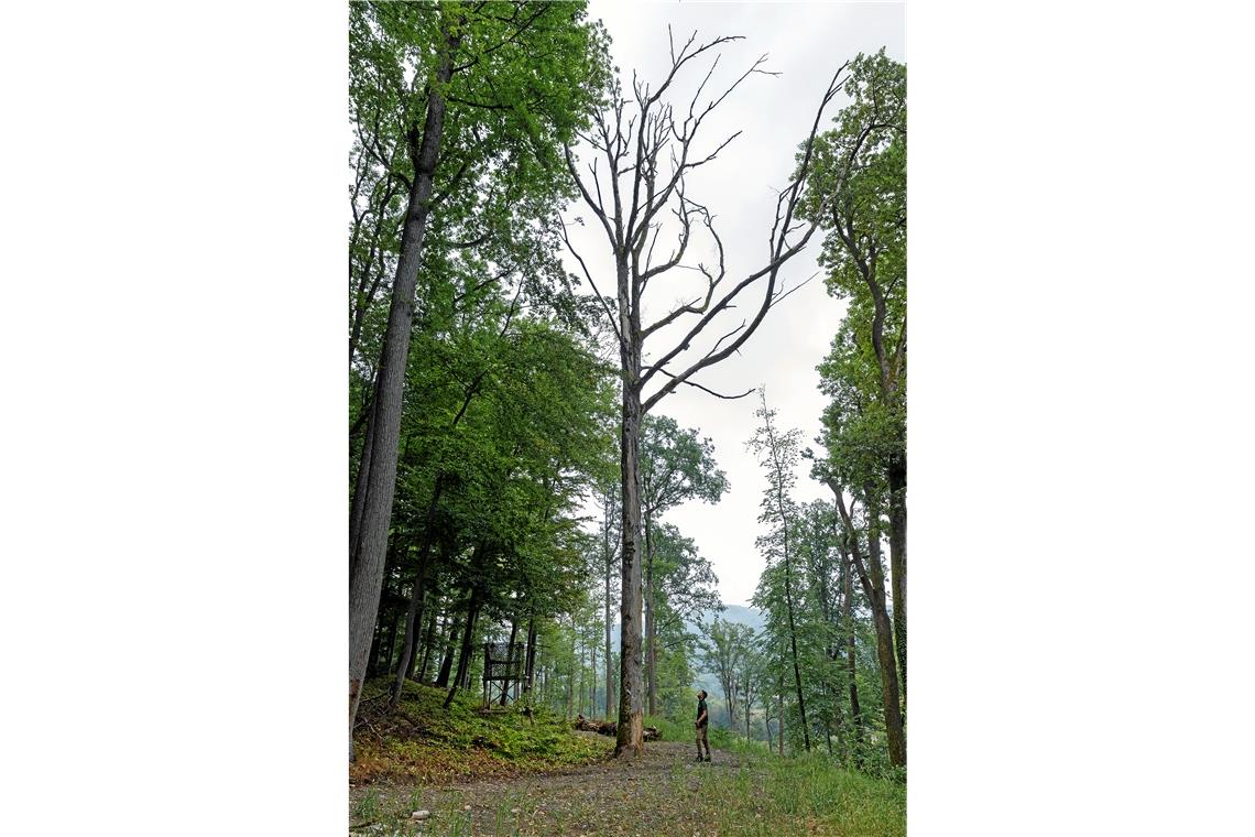 Förster Christian Hamann steht bei einem toten Baum. Einige kranke und tote Bäume lässt er stehen. Sie bieten Tieren, Pflanzen und Pilzen Nährstoffe und Unterschlupf. Fotos: Jörg Fiedler