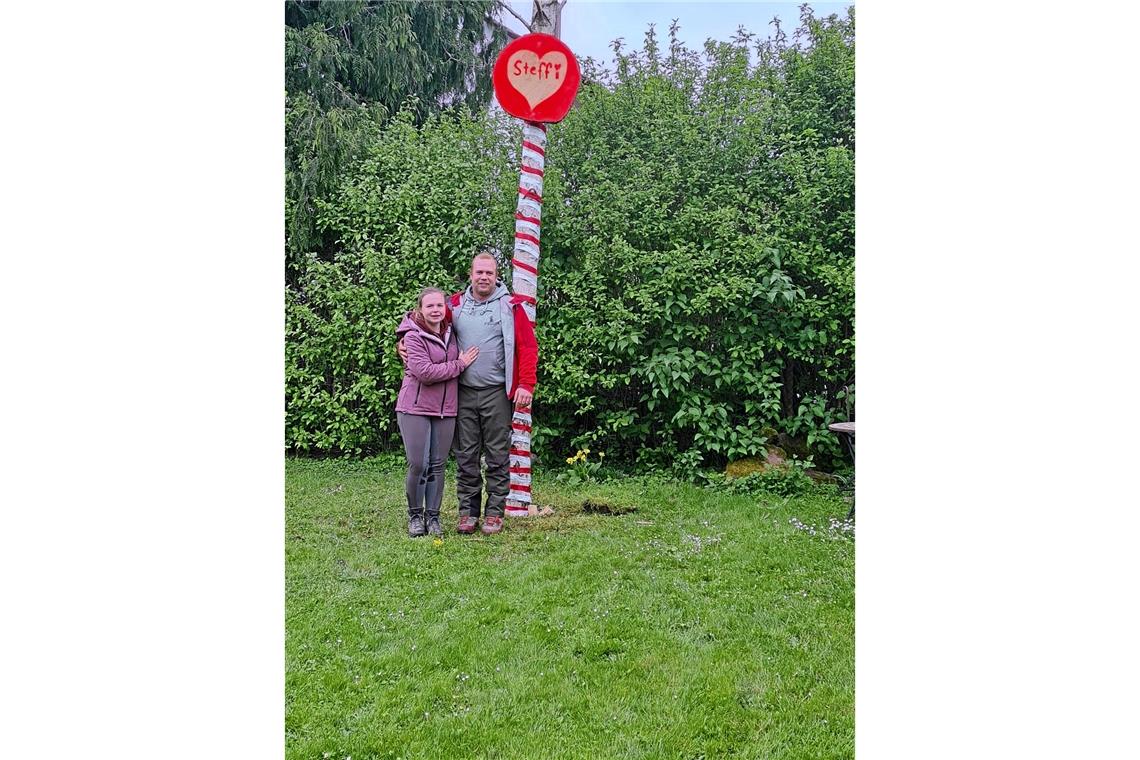 Für die Umsetzung seines Plans, seine Freundin mit einem Maibaum und einem Kniefall zu überraschen, kam Lars Fischer entgegen, dass er den Inhaber der Firma Merkle aus Oppenweiler gut kennt. Er wusste, dass das Unternehmen am 30. April mit der Aufstellung des Maibaums am Aspacher Heimatmuseum beauftragt war. Und fragte kurzerhand, ob der Kran vorher einen weiteren Baum aufstellen könnte. Das Loch, in das der Stamm kommen sollte, habe er schon ein paar Tage vorher ausgehoben und mit Reisig bedeckt, berichtet Martina Maier. „Ich habe mich schon gewundert, was der Haufen dort soll“, sagt sie. „Aber meiner Nichte ist nichts aufgefallen.“