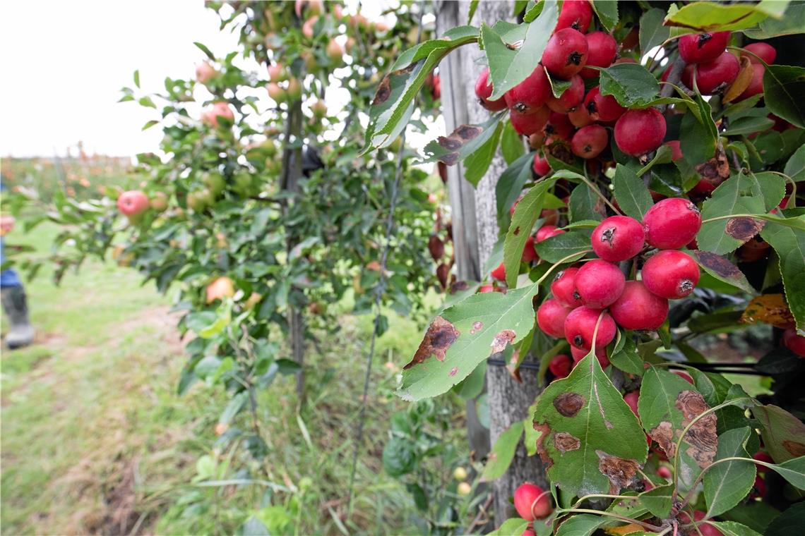 Seit etwa fünf Jahren gibt es den Roten Mond auf dem Hof Adrion. Die alte und robuste Sorte hat einen recht säuerlichen Geschmack und wird gewöhnlich erst im Oktober geerntet. Fotos: A. Becher
