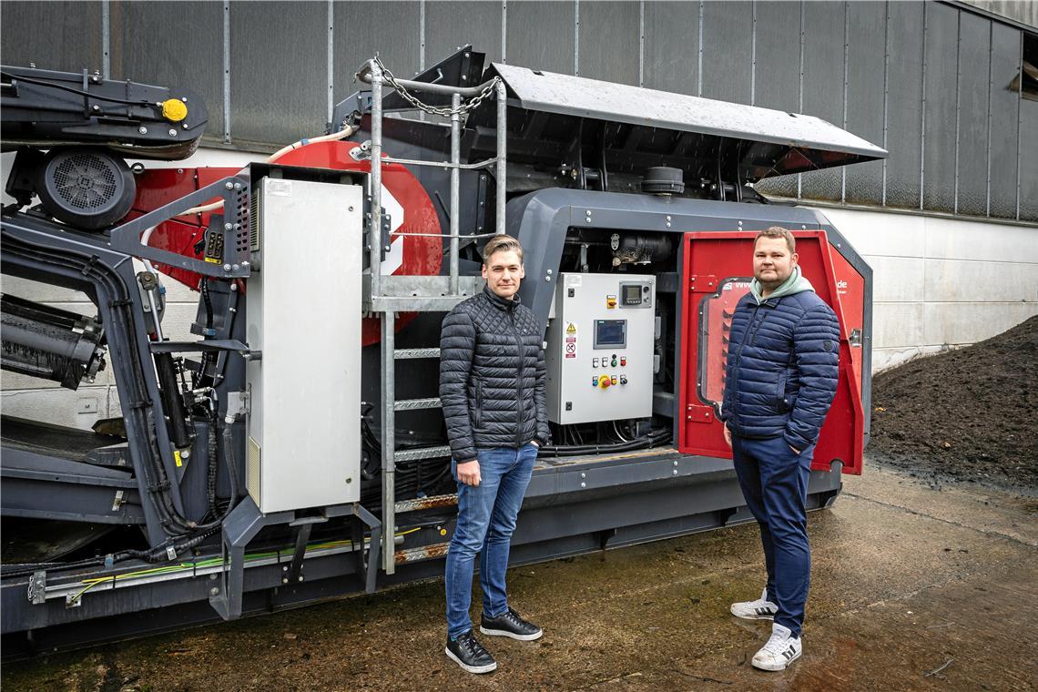 Benjamin Rader (links) und Alexander Rümke, die beiden Tino-Geschäftsführer, haben den Kampf noch nicht aufgegeben, dass ihr Steinbrecher, der noch ungenutzt hinter ihrer Halle steht, doch noch zum Einsatz kommen kann. Foto: Alexander Becher
