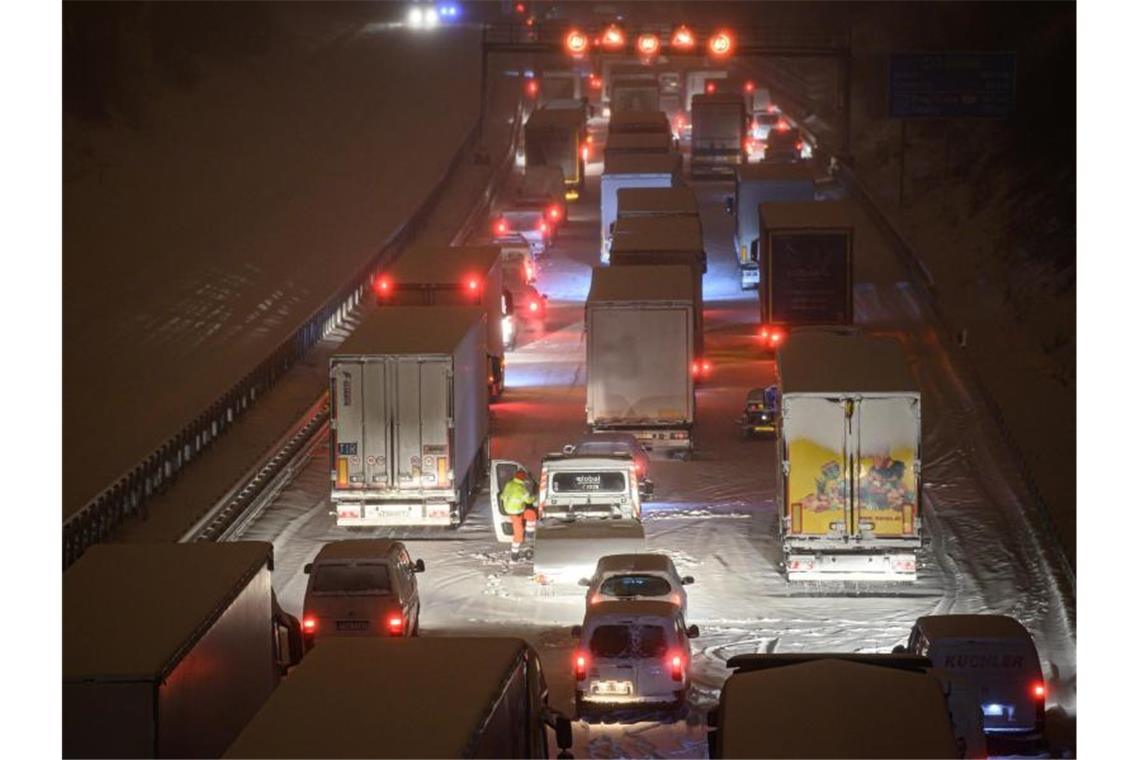 Autos und Lastwagen stecken am frühen Morgen bei Schneefall auf der verschneiten Autobahn 4 bei Dresden fest. Foto: Robert Michael/dpa-Zentralbild/dpa