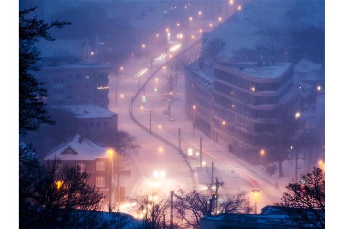 Fast schon wieder ein winterliches Idyll. Autos fahren in der Dämmerung auf einer zugeschneiten Straße durch Bielefeld. Foto: Friso Gentsch/dpa