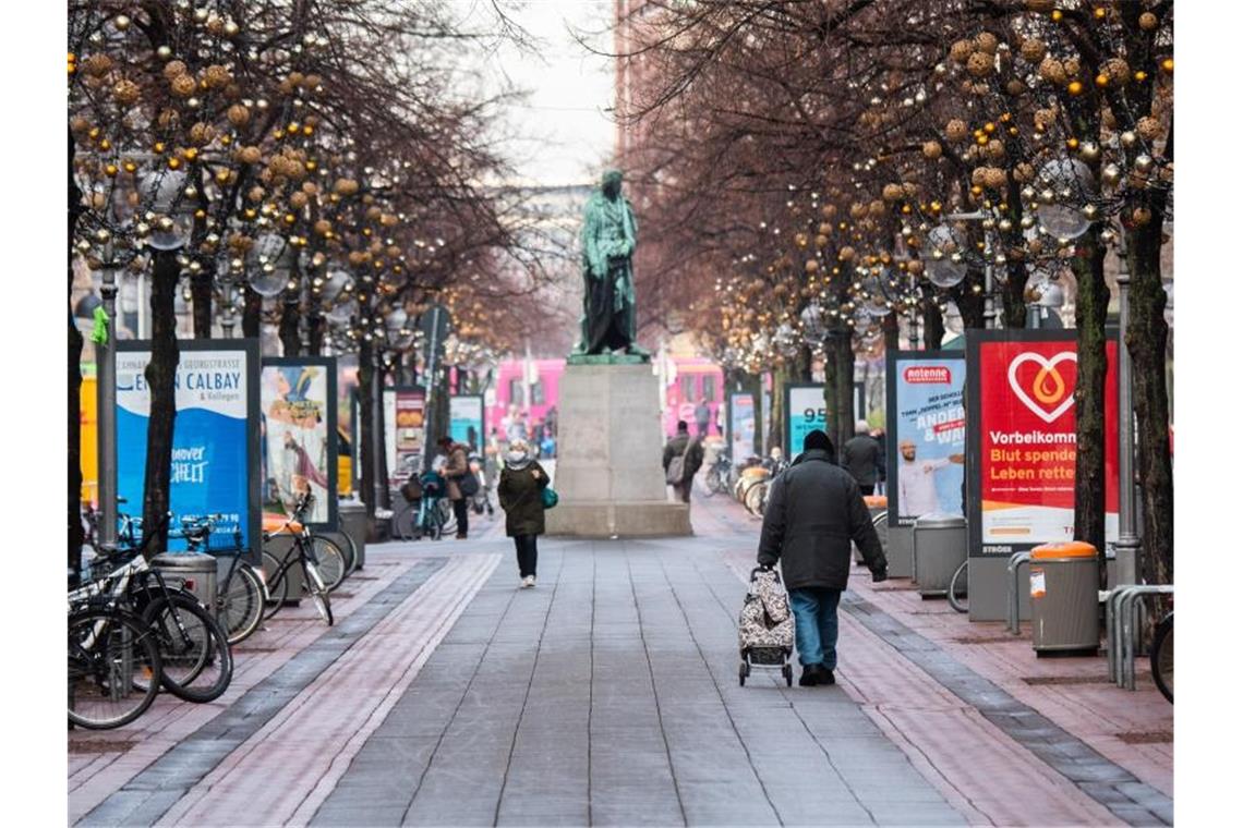 Passanten laufen durch die beinahe menschenleere Innenstadt von Hannover. Foto: Julian Stratenschulte/dpa