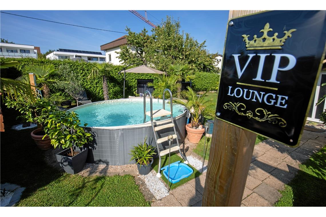 Passend zur tropischen Flora haben die Kaufmanns den Garten ihres Reiheneckhauses nach und nach in einen Südseestrand verwandelt. Der Pool von den Eltern ist längst einem komfortableren Modell gewichen: Dreieinhalb Meter Durchmesser, einen Meter tief. Eine Heizung temperiert das Wasser auf karibische 27 Grad, eine Pumpe lässt einen kleinen Wasserfall plätschern. Von innen hat Andreas Kaufmann das Becken mit sandfarbener Folie ausgekleidet: „So erscheint das Wasser nicht blau, sondern türkis wie in der Karibik“, erklärt der Hobby-Bademeister. Auch drumherum ist alles wie in einem Urlaubsparadies. Da gibt es bequeme Liegestühle, schicke Rattanmöbel und sogar einen echten Strandkorb. Mischling Buddy bekommt in Kürze noch einen eigenen Hundestrandkorb. Passend dazu hat Andreas Kaufmann in diesem Jahr mit zwölf Säcken Sand aus dem Baumarkt einen kleinen Strand aufgeschüttet. Den Gartenzaun dahinter verdeckt ein wetterfester Sichtschutz, der mit dem Foto eines Traumstrands auf den Malediven bedruckt ist.