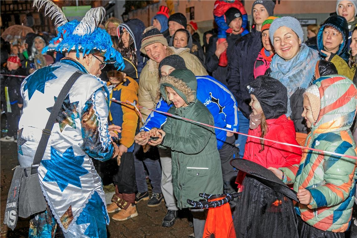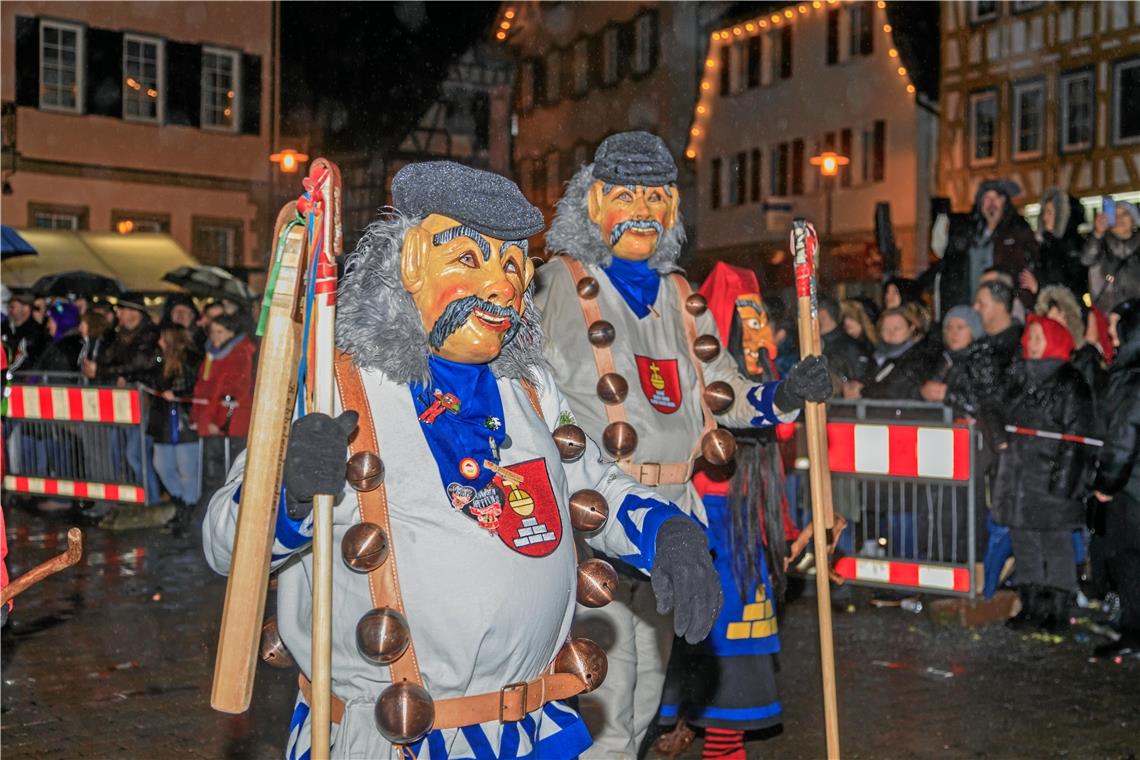 Hinter den beiden wird es wilder: Die Wasserfratzen und Feuerbarthl, das Hexenturmweible, der Hotz, der Nachtkrabb und der Tannenzapfengurgler – die Figuren der Murrhardter Zunft hüpfen, tanzen oder schlurfen vorwärts, verteilen Süßes und treiben Schabernack mit den Zuschauern.