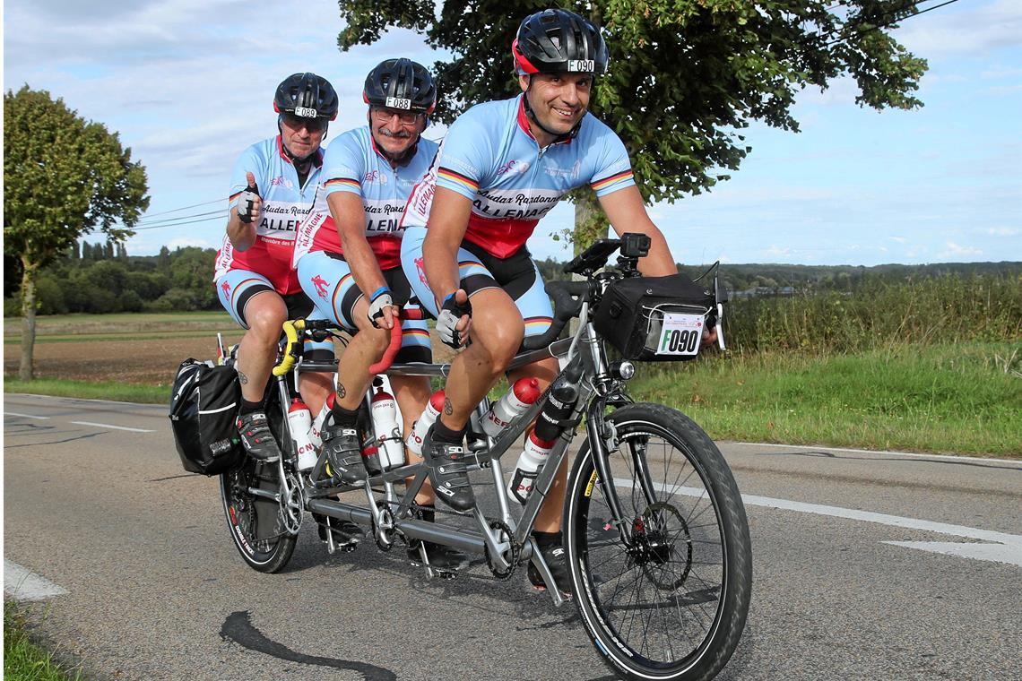 Andreas Claß ist als Frontmann für das sichere Durchkommen des „Raumgleiters“, wie die drei ihr Tridem auch nennen, zuständig. Eugen und Roland (von links) sehen sich schwerpunktmäßig als Antriebsdoppelpack. Ihr selbst gebautes Rad hat den Brüdern besonders bei der fünften Teilnahme gute Dienste erwiesen und dabei kein einziges Wehwehchen gehabt. Fotos: privat