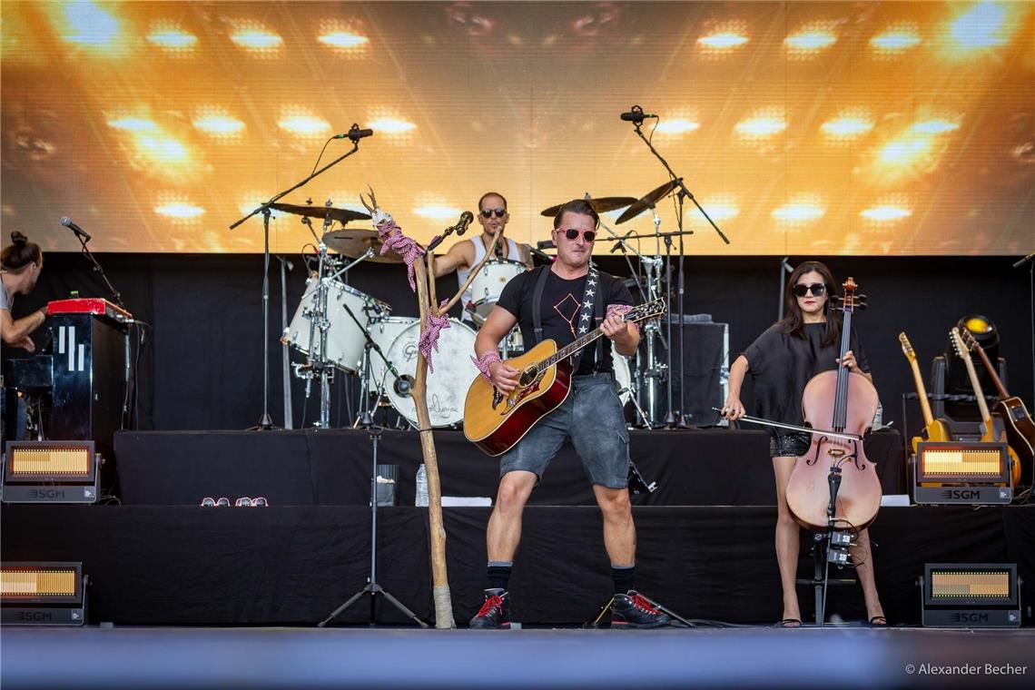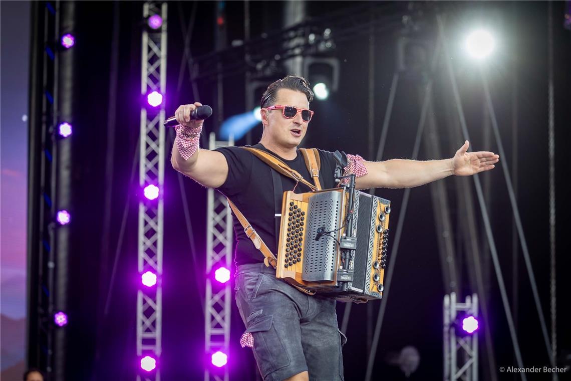 Aspach. Als Andreas Gabalier am Samstagabend auf die Bühne tritt, fackelt er nicht lange. Mit Schwung legt er los und heizt dem Publikum mit einem 16-minütigen Intro ein, in welchem er verschiedene Songs in Kürze aneinanderreiht. „I sing a Liad für di. Und dann frogst du mi. Mogst mid mir daunzn gehn. I glaub, i steh auf di“ – die 15000 Zuschauer und Zuschauerinnen in Großaspach-Fautenhau schwingen sogleich ihr Tanzbein, wärmen ihre Stimmbänder auf und klatschen begeistert in die Hände.