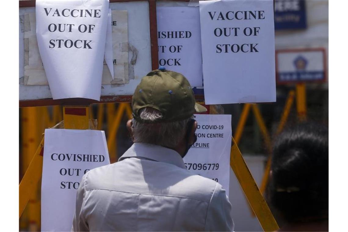 Am Tor eines Impfzentrums in Mumbai angebrachte Schilder weisen auf den Mangel an Impfstoff hin. Foto: Rafiq Maqbool/AP/dpa