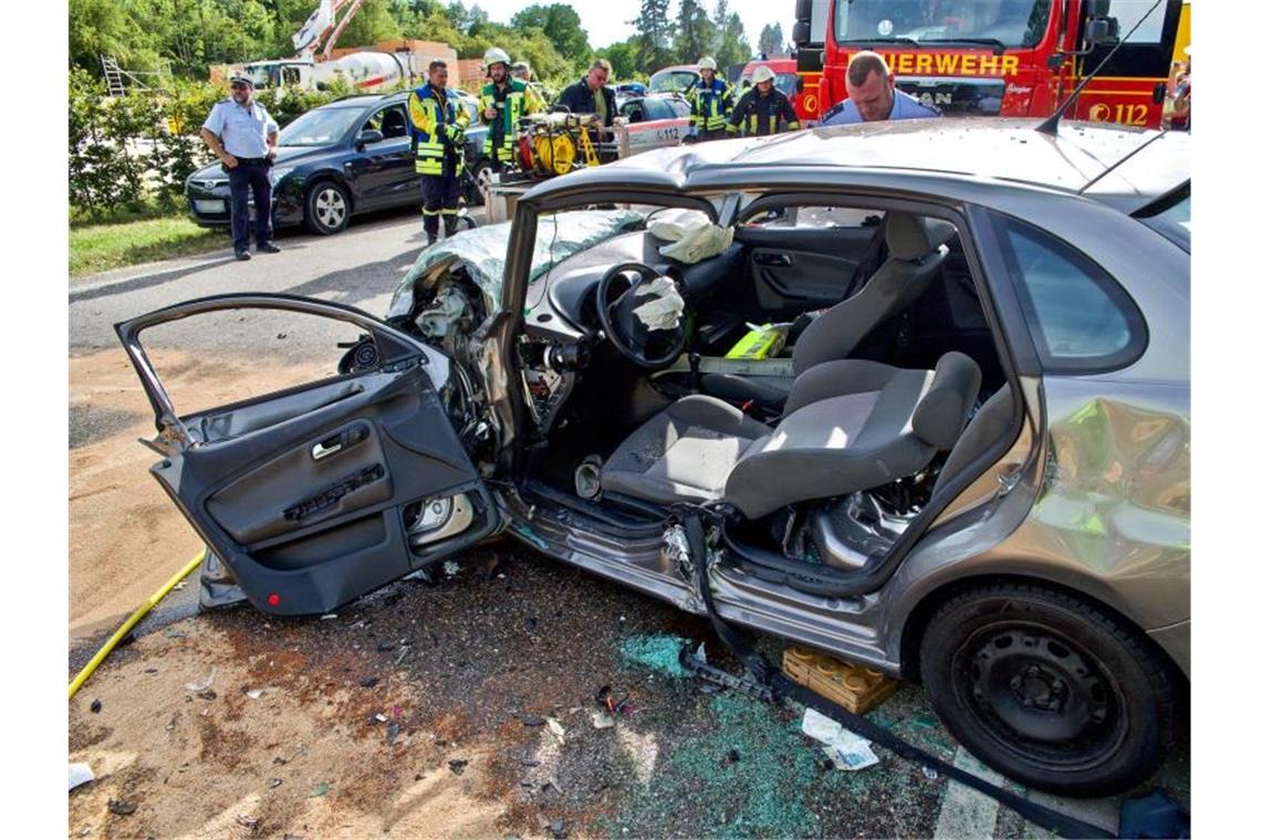 Einsatzkräfte stehen an der Unfallstelle auf der Bundesstraße 19 bei Herbrechtingen. Foto: Dennis Straub