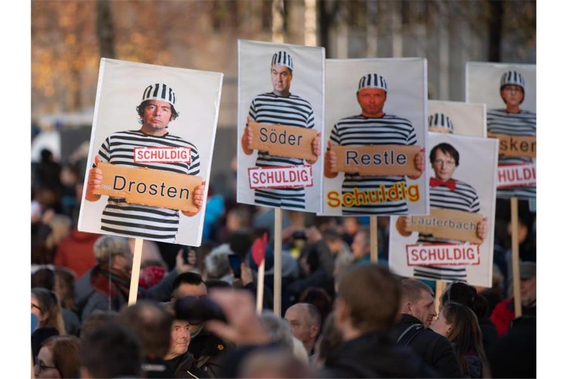 Auf einer Demonstration im November 2020 in Leipzig werden Wissenschaftler und Politiker als Sträflinge gezeigt. Foto: Sebastian Kahnert/dpa-Zentralbild/dpa