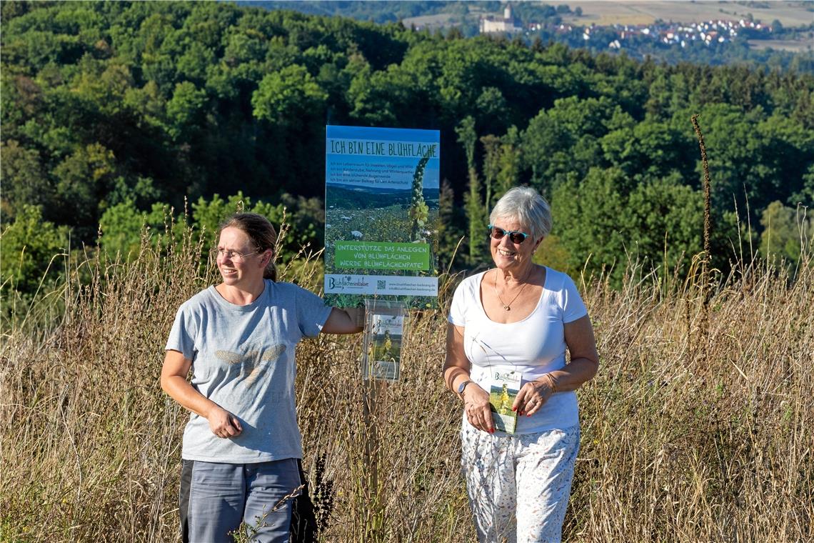 Tanja Fichtl (links) und Jutta Pütz engagieren sich in der Blühinitiative Backnang. Ihnen ist wichtig, dass die heimischen Pflanzen möglichst lange stehen bleiben. In diesem Jahr sind leider viele Pflanzen vertrocknet. Foto: Alexander Becher