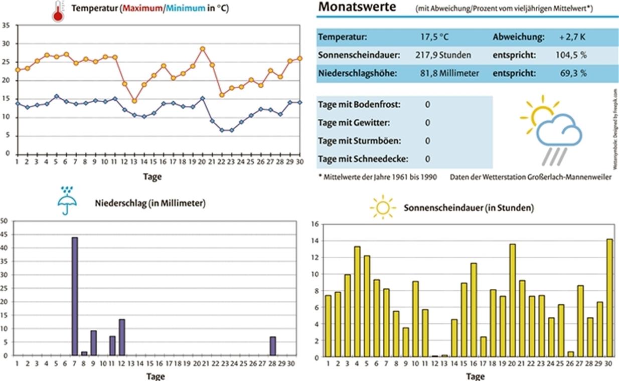 Dass im Juni die Tage besonders hell sind – die Sonnenwende am 21. Tag des Monats markiert den längsten Tag mit der kürzesten Nacht des Jahres –, schlägt sich vor allem in der Zahl der Sonnenstunden nieder. Sie bestimmt auch maßgeblich, ob wir das Wetter als gut oder schlecht empfinden. Auch in diesem Jahr erfüllte der Juni dahin gehend die Erwartungen. Mit insgesamt knapp 218 Sonnenstunden übertrifft er den vieljährigen Mittelwert um fast 10 Stunden. Grobe Ausreißer konnten lediglich an drei Tagen festgestellt werden: Am 12., 13. und 26. Tag des Monats kam man in Großerlach-Mannenweiler jeweils noch nicht einmal auf eine Stunde Sonnenschein. Versöhnlich stimmte hingegen der Abschluss. Am letzten Tag des Monats, dem vergangenen Freitag, schien die Sonne ganze 14,2 Stunden lang – der höchste Wert im Juni. Nur knapp dahinter rangiert der 20. Juni – an diesem Tag wiederum ermittelte die Messstation die höchste Tagestemperatur: 28,6 Grad Celsius. Lange währte die Hitze jedoch nicht, bereits am 21. Juni machte sich eine Kältefront bemerkbar. An vier Tagen sanken die Mindesttemperaturen auf einstellige Gradzahlen. Ab dem Siebenschläfertag (27. Juni) breitete sich ein aus Großbritannien kommendes, kräftiges Hoch in Deutschland aus, mit einem Tag Verspätung und etwas Regen im Gepäck kam es auch im Rems-Murr-Kreis an.