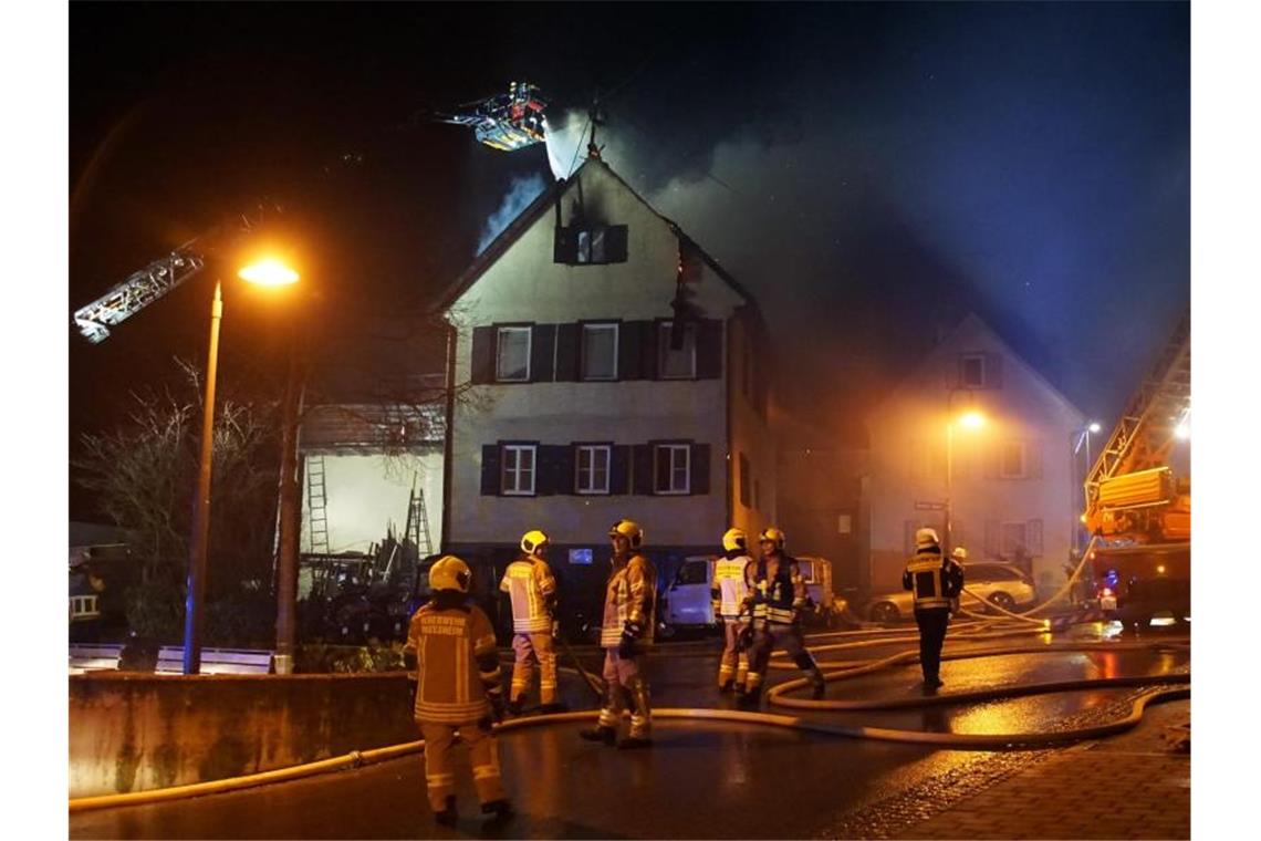 Feuerwehrleute löschen den Brand eines Wohnhauses im Rutesheimer Ortsteil Perouse. Foto: Dettenmeyer/SDMG/dpa