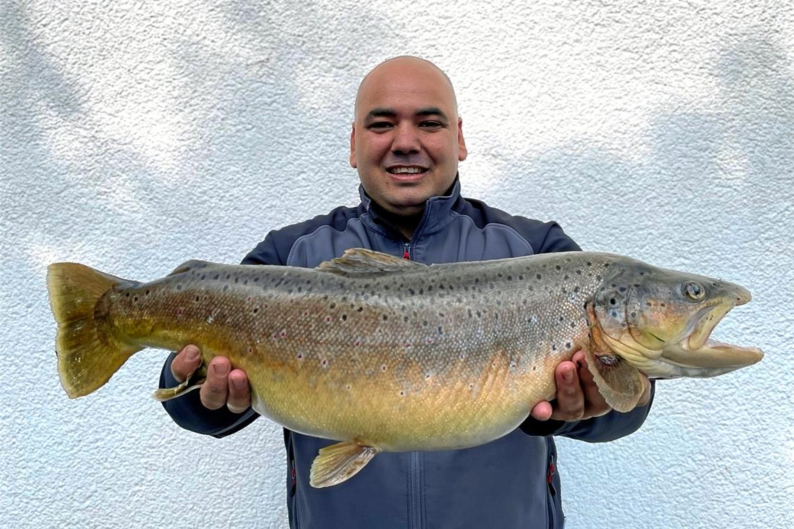 Kubilay Özcan fängt eine 74 Zentimeter lange Forelle