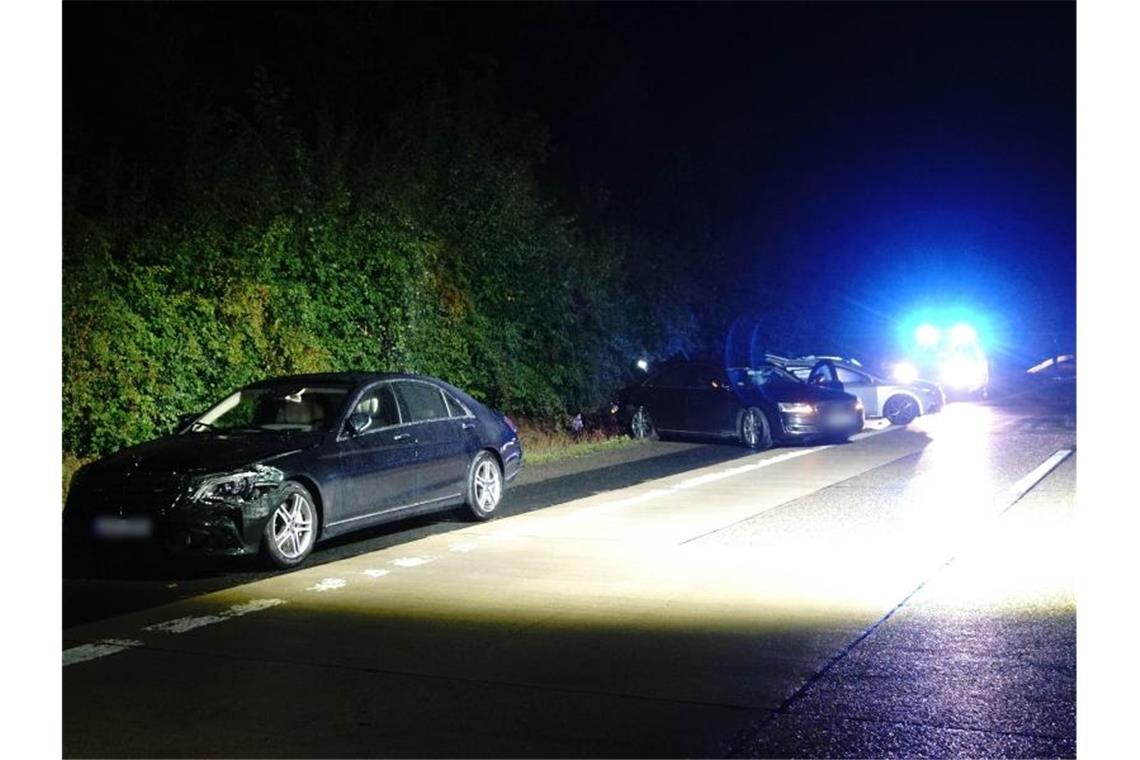 Das Fahrzeug von Ministerpräsident Kretschmann (l-r), ein Begleitfahrzeug sowie ein anderer am Unfall beteiligter Pkw stehen nach einem Unfall am Straßenrand. Foto: Franziska Hessenauer/Einsatz-Report24/dpa