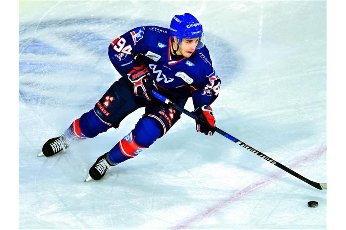 Mannheims Phil Hungerecker spielt den Puck. Foto: Uwe Anspach/dpa/Archivbild
