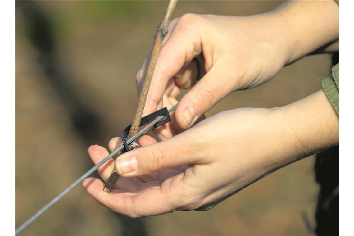Nachdem ich dann nach einiger Zeit doch noch eine Weide erfolgreich gewickelt habe, sind wir beide der Meinung, dass das jetzt auch ausreicht und wechseln zu den Kunststoffklammern. Wieder wird die Rebe vorsichtig nach unten gebogen und festgehalten, die Klammer hinter ihr angesetzt und links und rechts am Draht befestigt. Ganz einfach.